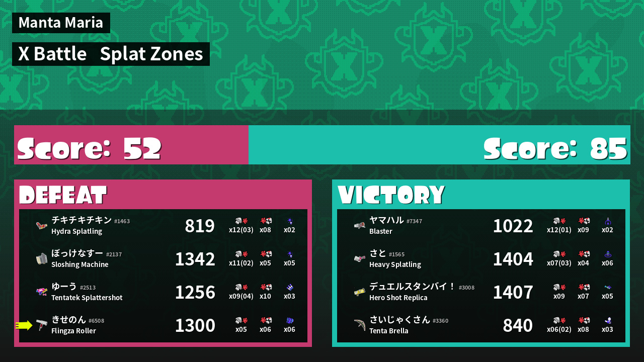 | Medals | #1 Ground Traveler #1 Tenta Missiles User #2 Splat Zone Inker | ||