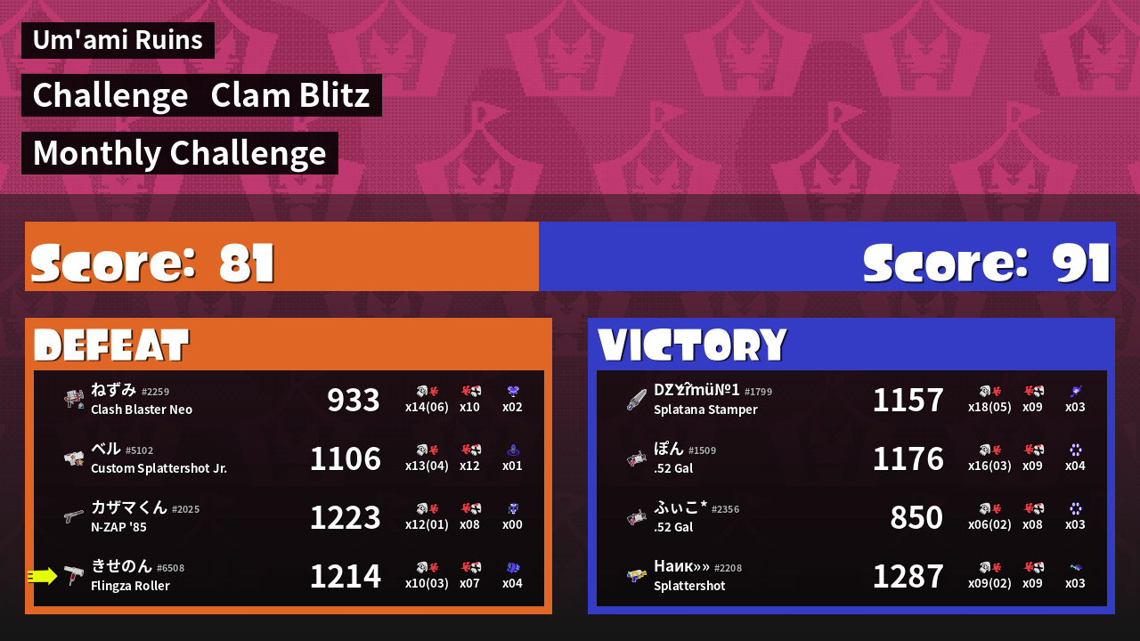 | Medals | #1 Score Booster #1 Tenta Missiles User #2 Clam Carrier | ||