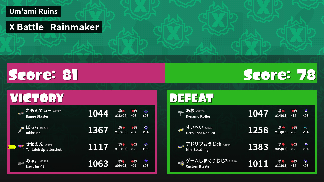 | Weapon | Tentatek Splattershot ( Splat Bomb / Triple Inkstrike) | ||