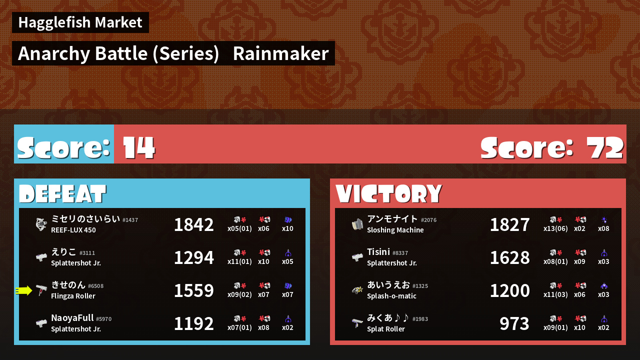 | Medals | #1 Super Jump Spot #1 Splat Assister #2 Overall Splatter | ||