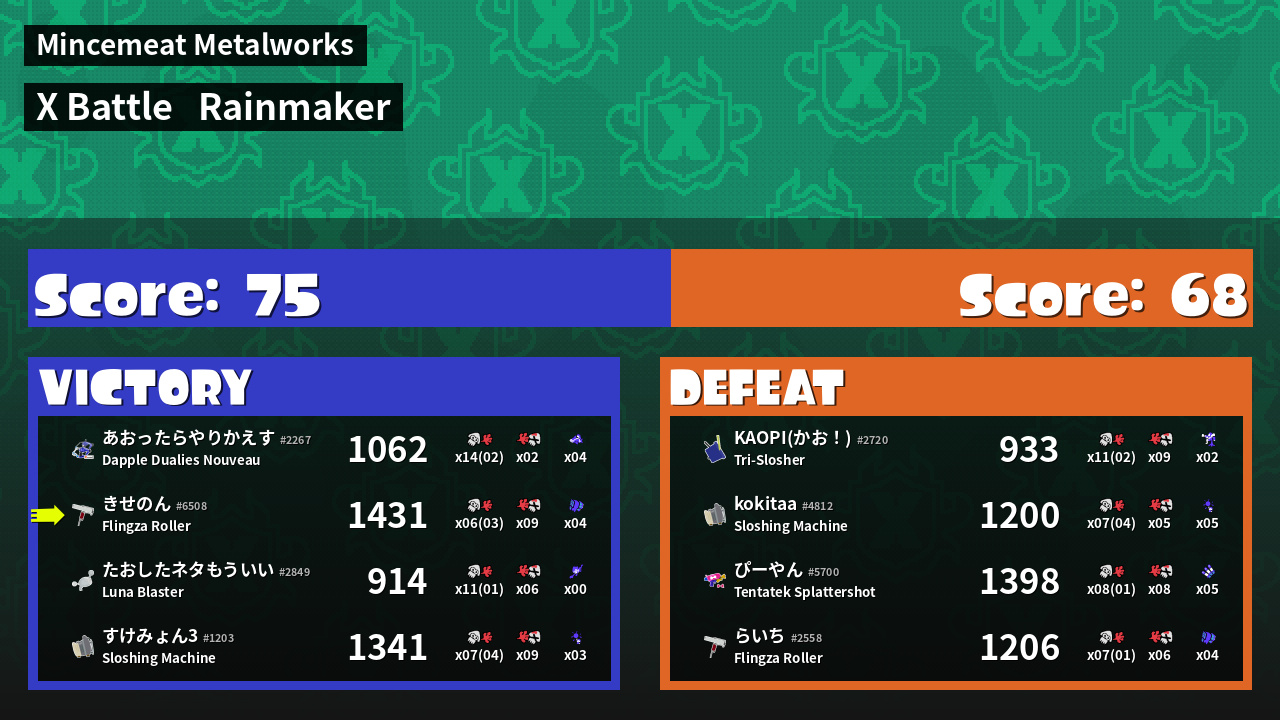 | Weapon | Flingza Roller ( Ink Mine / Tenta Missiles) | ||