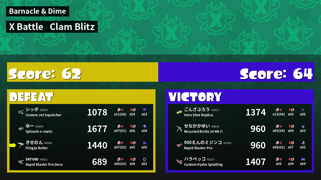 | Medals | #1 Clam Stopper #1 Damage Taker #1 Tenta Missiles User | ||