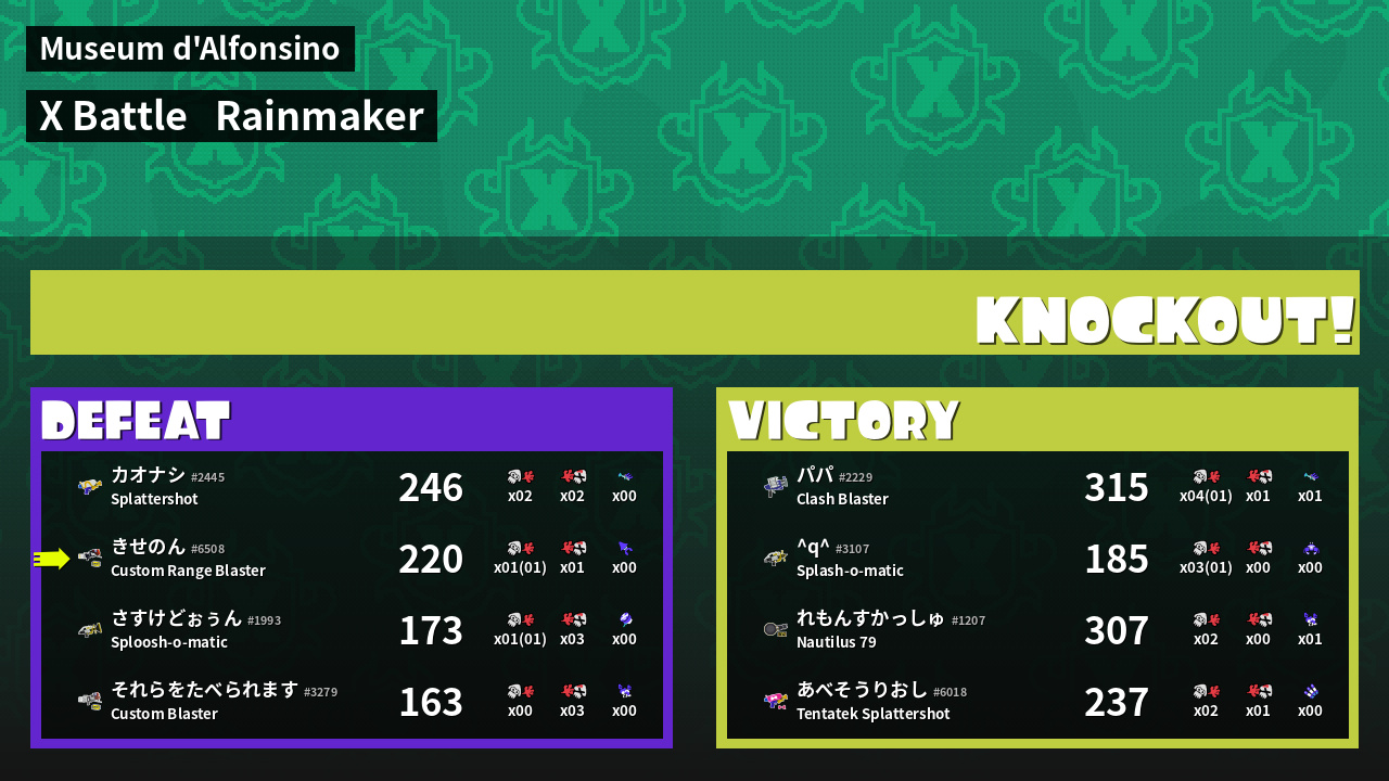 | Weapon | Custom Range Blaster ( Splat Bomb / Kraken Royale) | ||