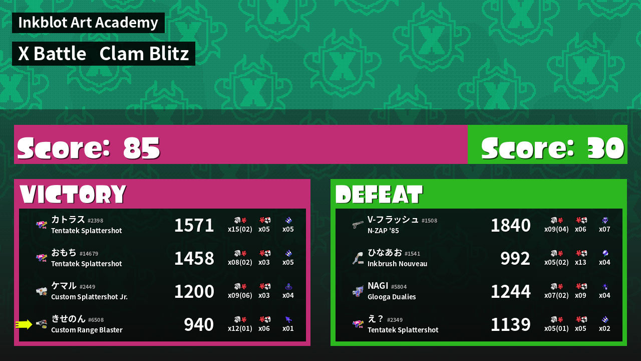 | Medals | #1 Ground Traveler #1 Kraken Royale User #2 Overall Splatter | ||