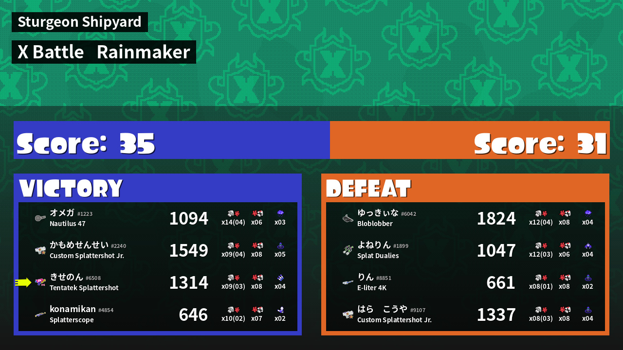 | Medals | #1 Super Jump Spot #1 Rainmaker Carrier #1 Ink Consumer | ||
