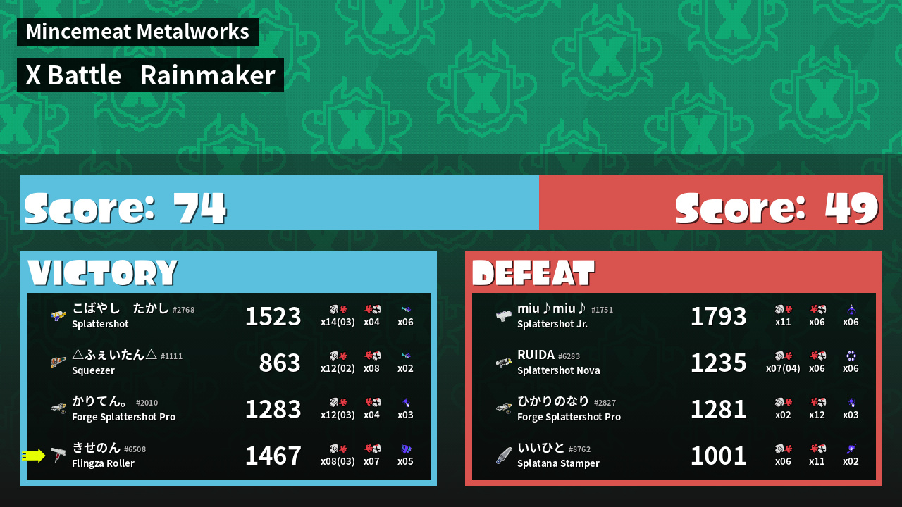 | Medals | #1 Splat Assister #1 Checkpoint Breaker #1 Rainmaker Stopper | ||