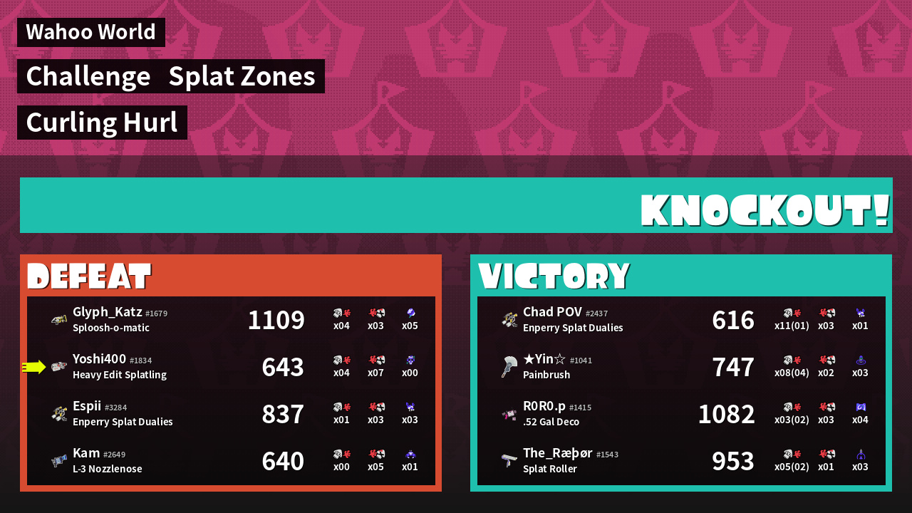 | Medals | #1 Overall Splatter #1 Splat Zone Guard #1 Enemy Splatter | ||