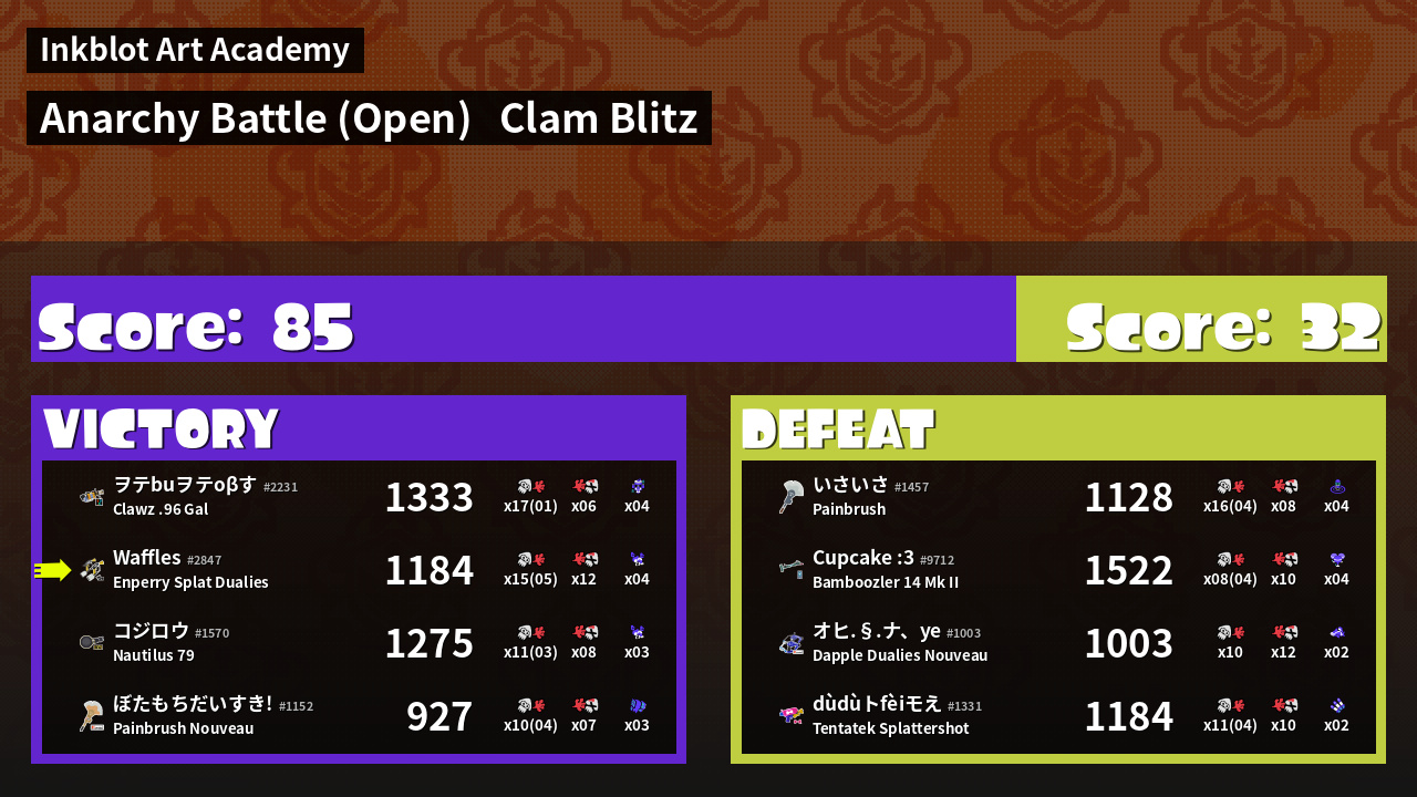 | Medals | #1 Clam Carrier #1 Splat Assister #1 Damage Taker | ||