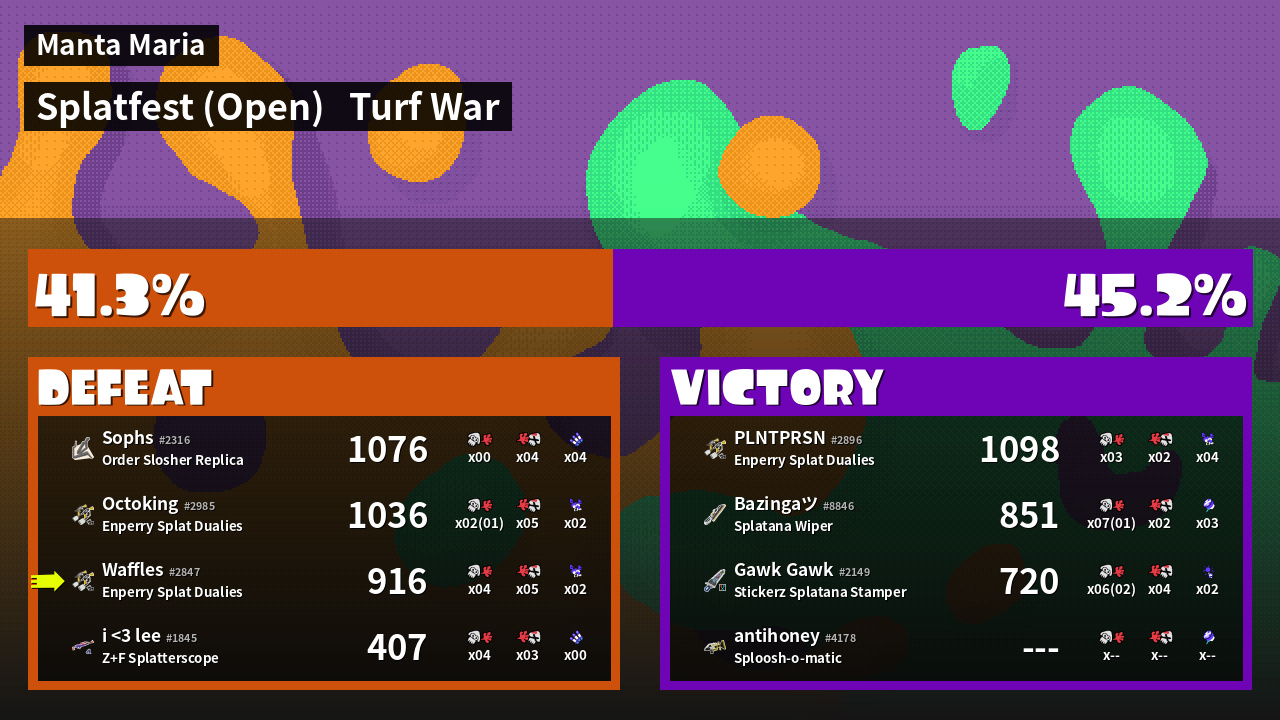 | Weapon | Enperry Splat Dualies ( Curling Bomb / Triple Splashdown) | ||