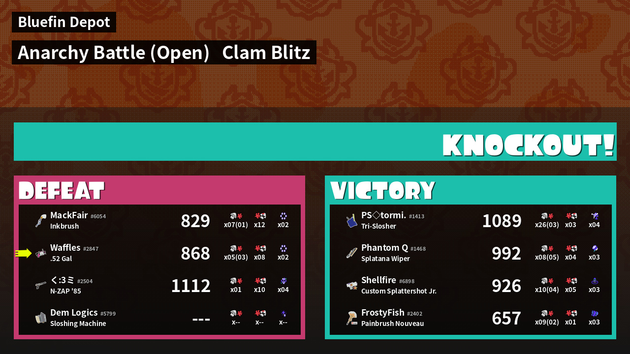 | Medals | #1 Popular Target #1 Splat Assister #1 Clam Stopper | ||