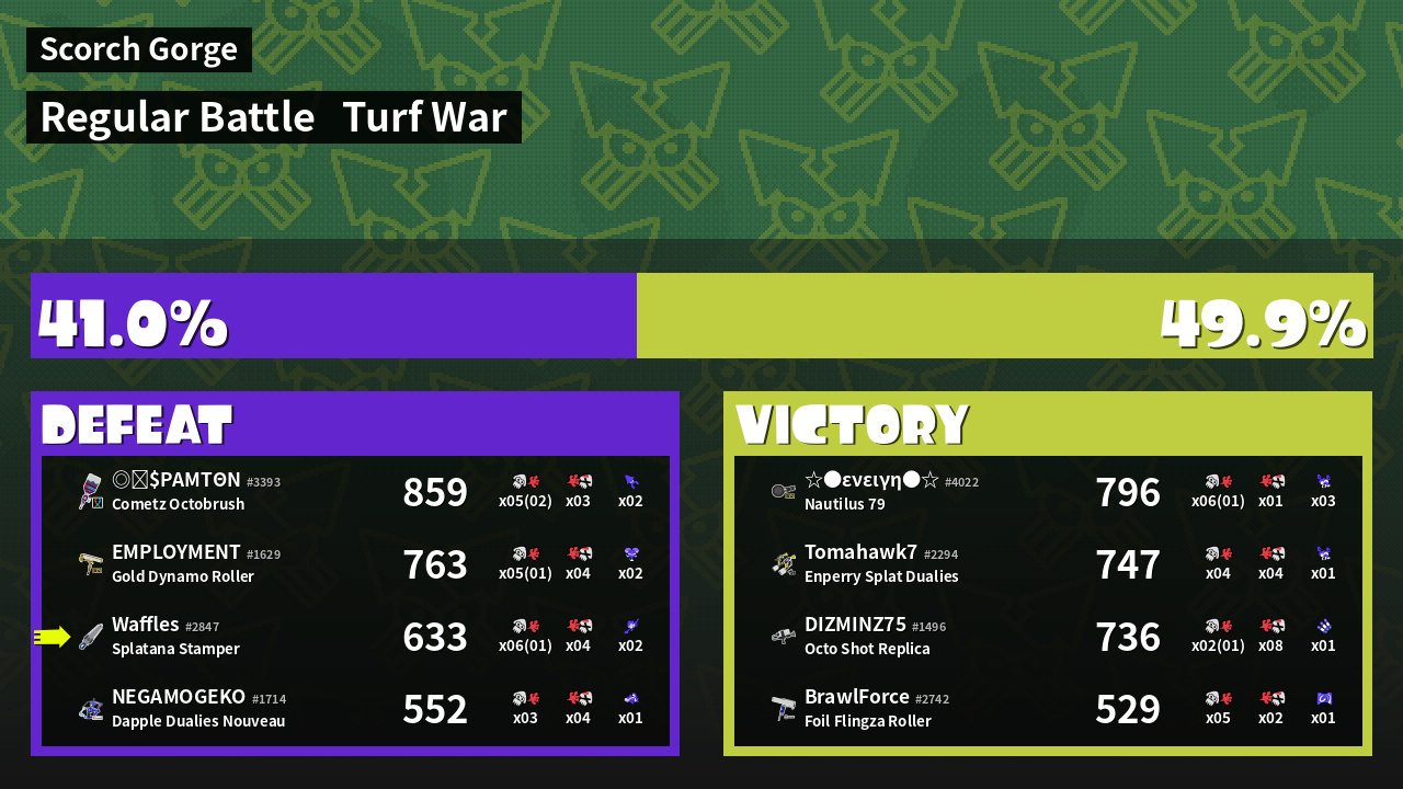 | Medals | #1 Overall Splatter #1 Enemy Splatter #1 Ink Consumer | ||