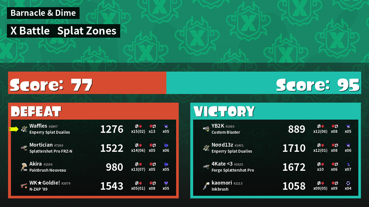 | Medals | #1 Overall Splatter #1 Splat Zone Guard #1 Enemy Splatter | ||
