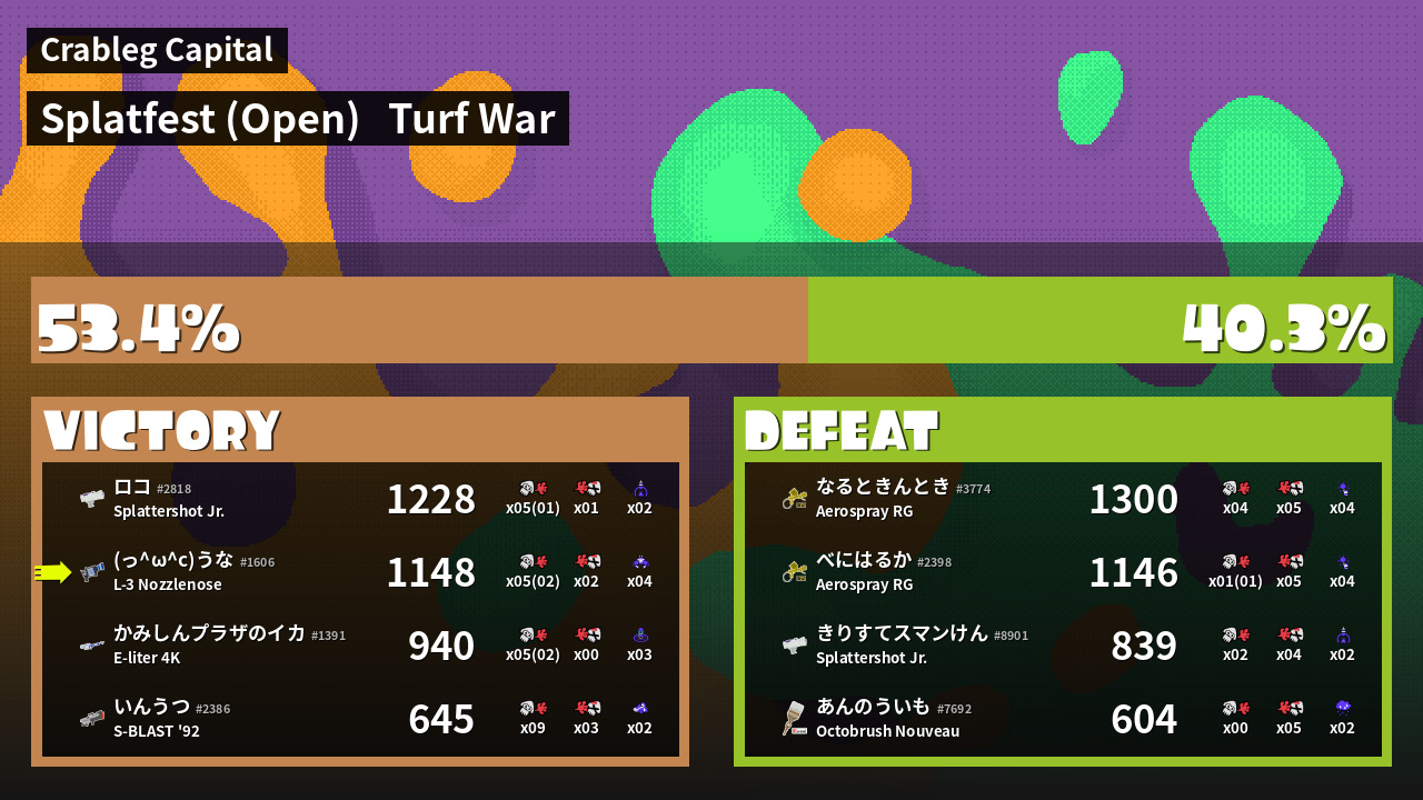 | Medals | #1 Enemy-Base Inker #1 Splat Assister #1 Crab Tank User | ||