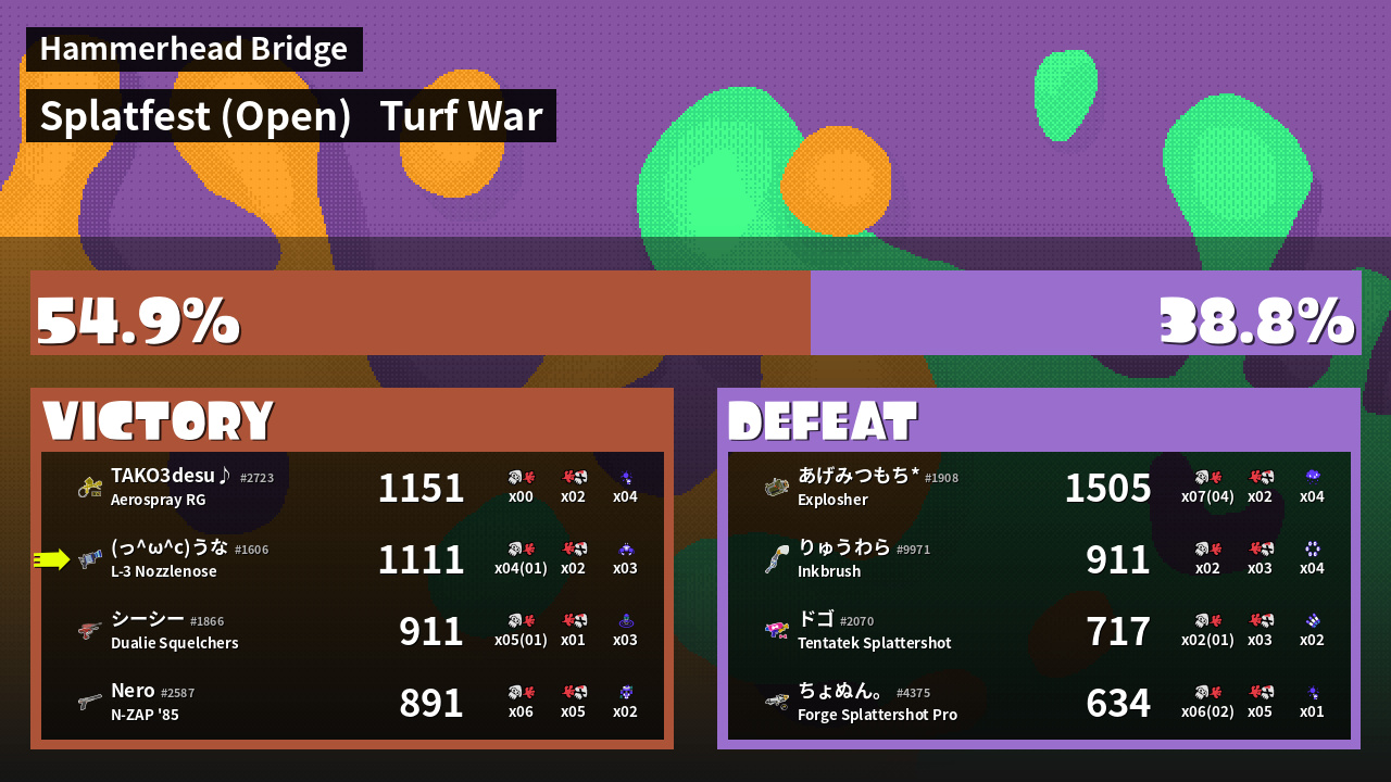 | Medals | #1 Home-Base Inker #1 Splat Assister #1 Ground Traveler | ||