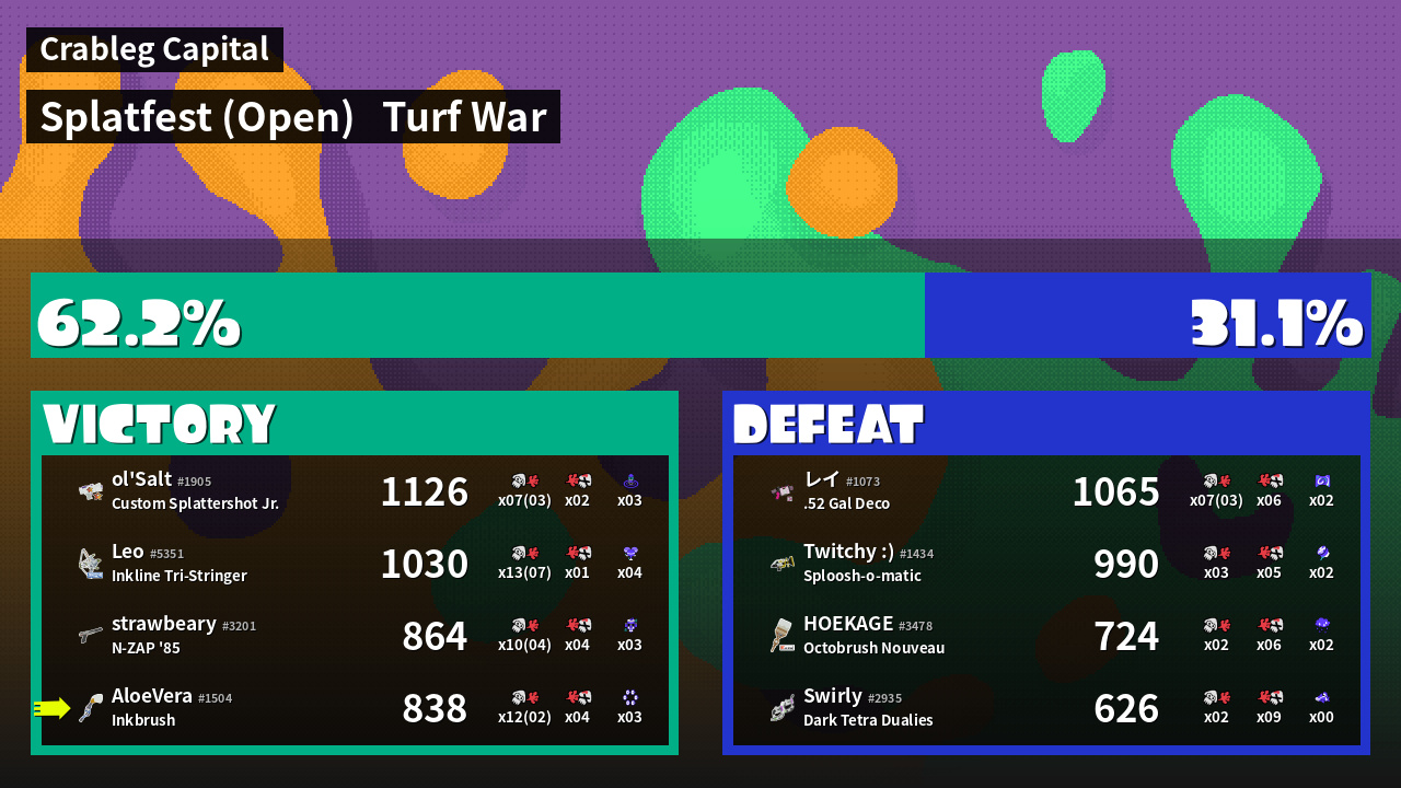 | Medals | #1 Popular Target #1 Home-Base Inker #1 Enemy Splatter | ||