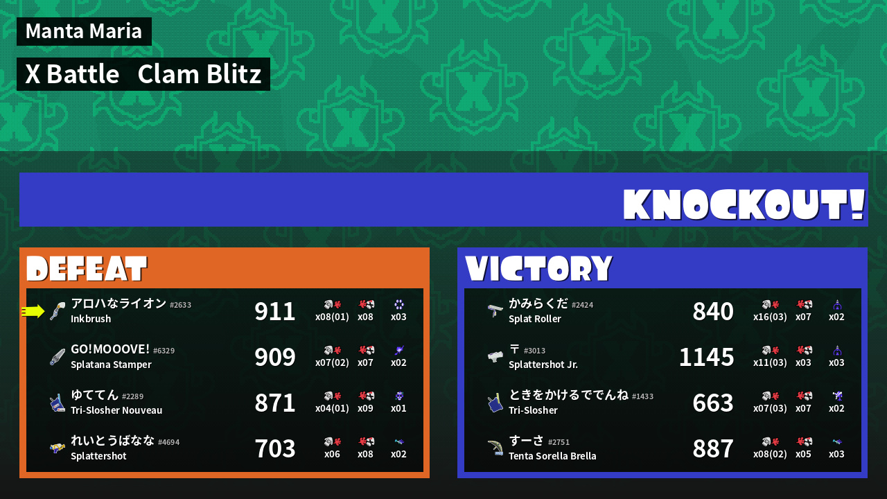 | Medals | #1 Overall Splatter #1 Score Booster #1 Clam Carrier | ||