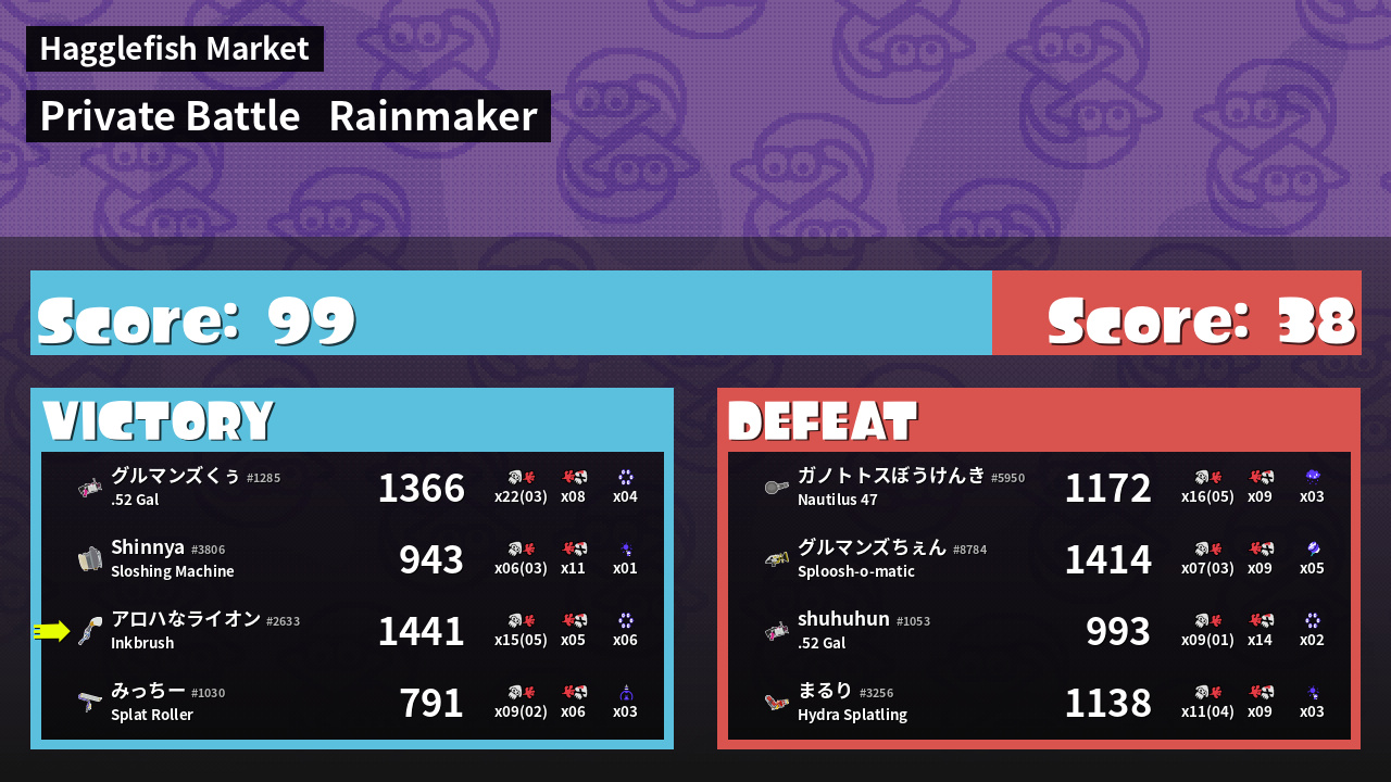 | Medals | #1 Turf Inker #1 Splat Assister #1 Checkpoint Breaker | ||