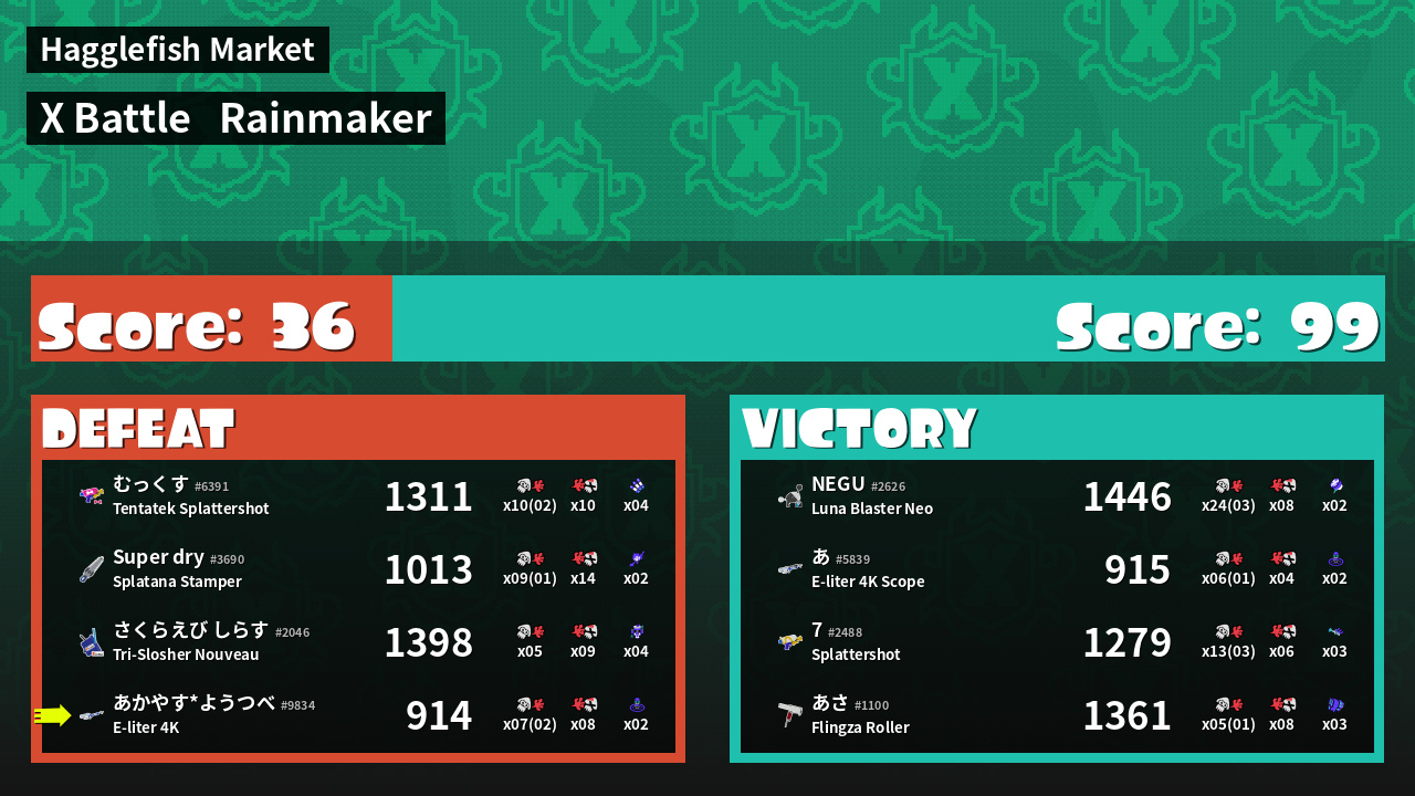 | Medals | #1 Splat Assister #1 Rainmaker Carrier First Splat! | ||