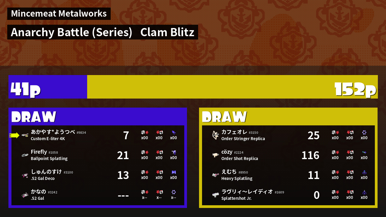| スピナー界のバレルスピナー使い  えむち #8950 |  Heavy Splatling                    | 11 | 0 + 0 | 0 | 1.00 |  0 | |