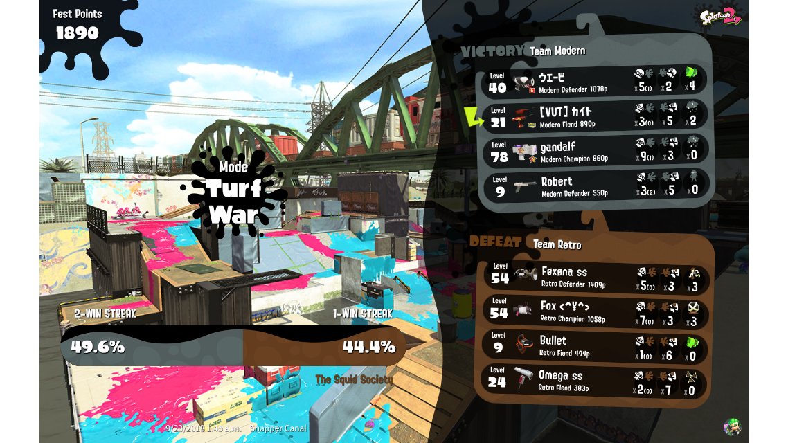 | Splatfest Title | Modern Fiend 228 → Modern Defender 48 | ||||||||||||||||||||||||||||