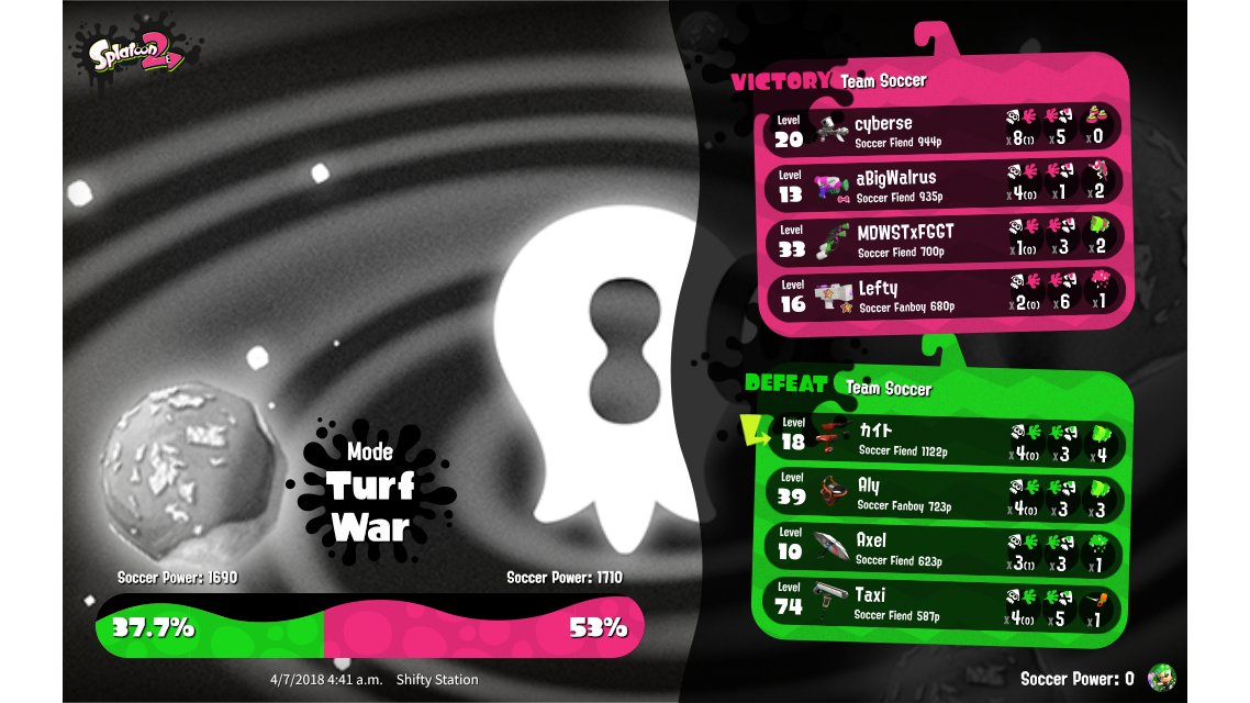 | Splatfest Title | Soccer Fiend 2 → Soccer Fiend 4 | ||||||||||||||||||||||||||||||||||
