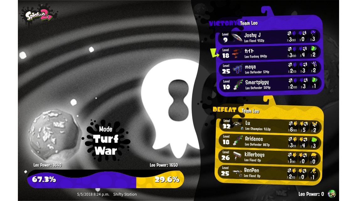 | Splatfest Title | Leo Fanboy 8 → Leo Fiend 4 | |||||||||||||||||||||||||
