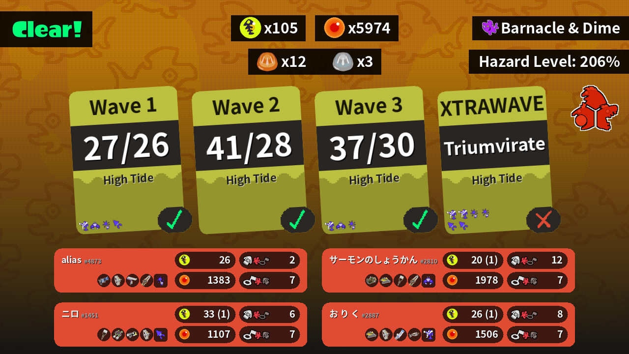 | Weapons | L-3 Nozzlenose Grizzco Stringer Splat Roller Grizzco Splatana | Octobrush Splat Dualies Splattershot Nova Grizzco Stringer | Dread Wringer Grizzco Stringer Mint Decavitator Grizzco Charger | Explosher Dread Wringer Octobrush Grizzco Splatana |