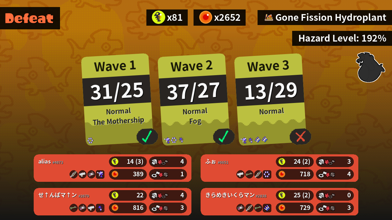| Weapons | Splatana Wiper Splattershot Jr. .52 Gal | .52 Gal Splatana Wiper Bamboozler 14 Mk I | Splattershot Jr. Bamboozler 14 Mk I Splatana Wiper | Bamboozler 14 Mk I .52 Gal Splattershot Jr. |