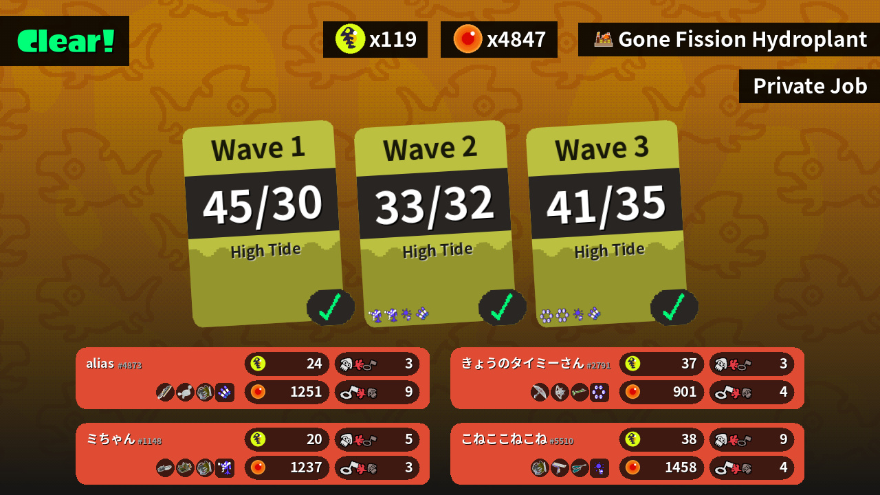 | Weapons | Splatana Wiper Luna Blaster Grizzco Slosher | Grizzco Slosher Splat Roller Jet Squelcher | Splat Brella Tri-Stringer Bamboozler 14 Mk I | Ballpoint Splatling Explosher Grizzco Slosher |