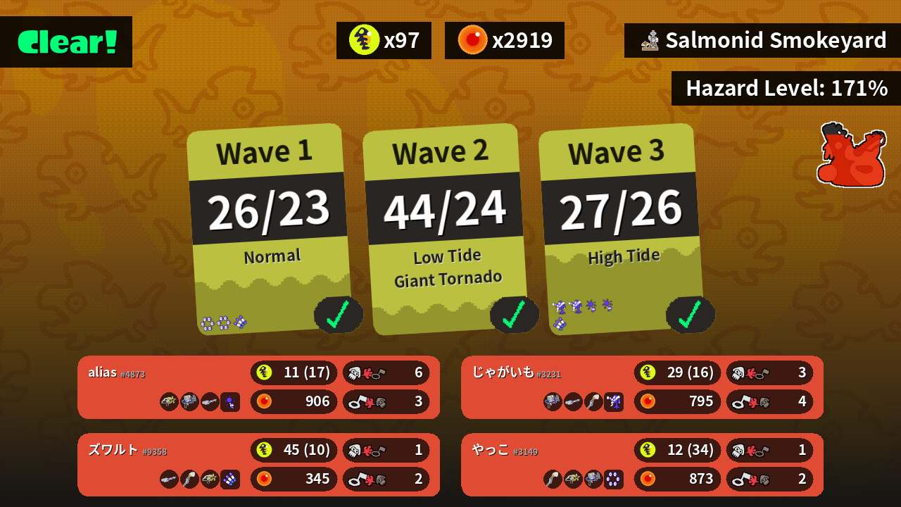 | Weapons | Splash-o-matic Clash Blaster E-liter 4K | E-liter 4K Inkbrush Splash-o-matic | Clash Blaster E-liter 4K Inkbrush | Inkbrush Splash-o-matic Clash Blaster |
