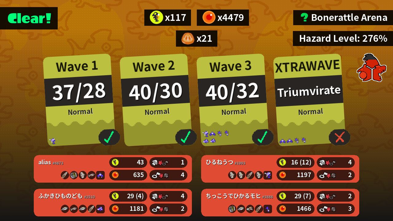 | Weapons | Grizzco Splatana Grizzco Slosher Grizzco Stringer Grizzco Charger | Grizzco Slosher Grizzco Brella Grizzco Blaster Grizzco Splatana | Grizzco Brella Grizzco Charger Grizzco Brella Grizzco Splatana | Grizzco Stringer Grizzco Stringer Grizzco Splatana Grizzco Stringer |