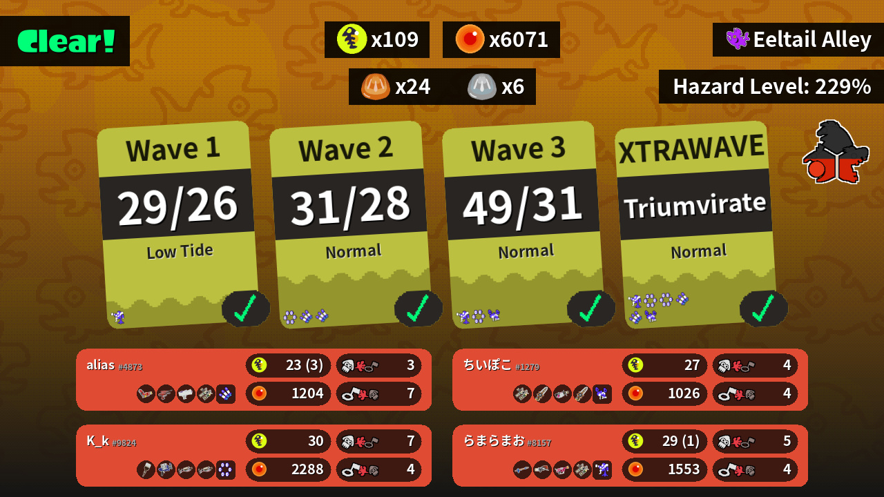 | Weapons | Hydra Splatling Dualie Squelchers Splattershot Jr. Grizzco Dualies | Octobrush Clash Blaster Grizzco Charger Grizzco Charger | Snipewriter 5H Range Blaster Rapid Blaster Pro Grizzco Dualies | Grizzco Dualies Grizzco Splatana .96 Gal Grizzco Splatana |
