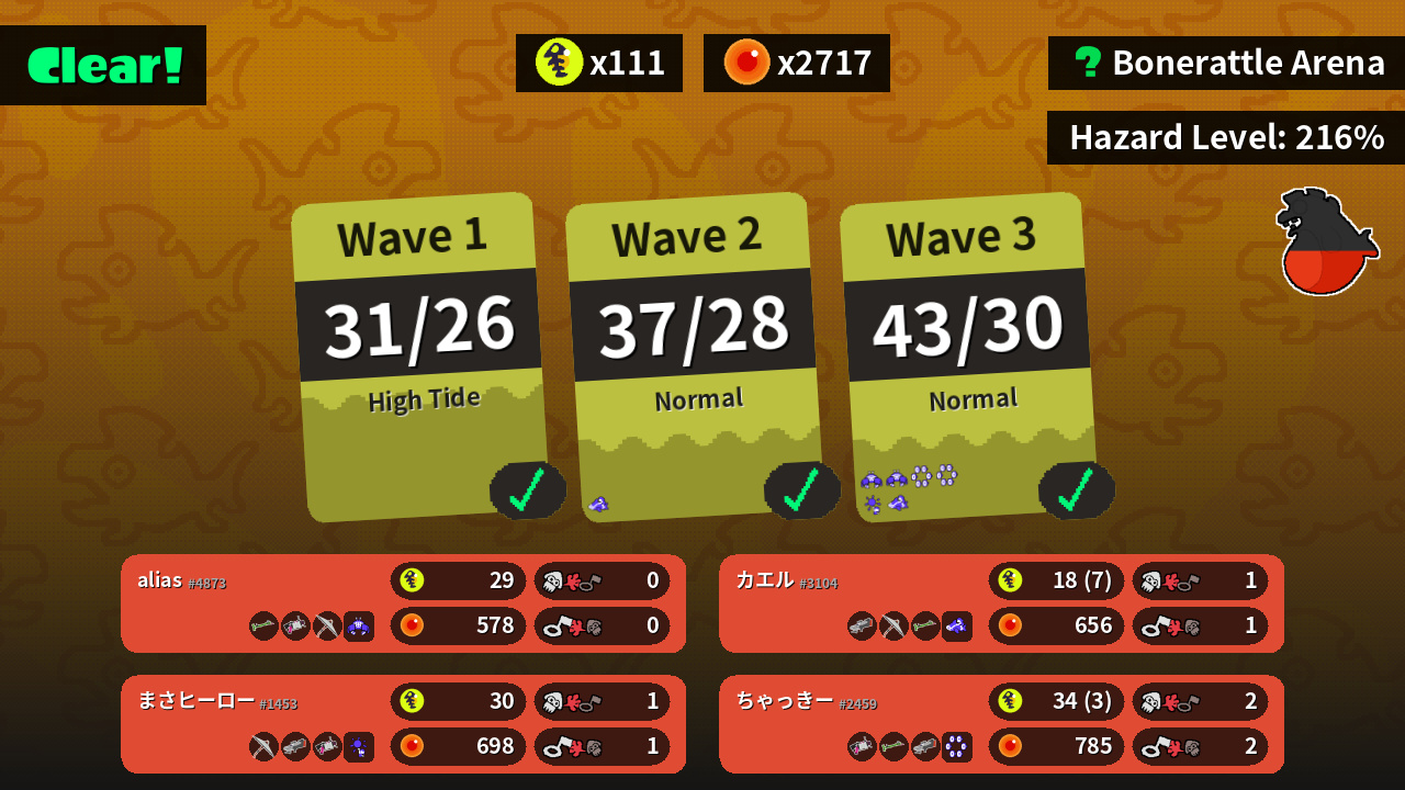 | Weapons | Bamboozler 14 Mk I .52 Gal Recycled Brella 24 Mk I | .52 Gal Bamboozler 14 Mk I S-BLAST '92 | Recycled Brella 24 Mk I S-BLAST '92 .52 Gal | S-BLAST '92 Recycled Brella 24 Mk I Bamboozler 14 Mk I |