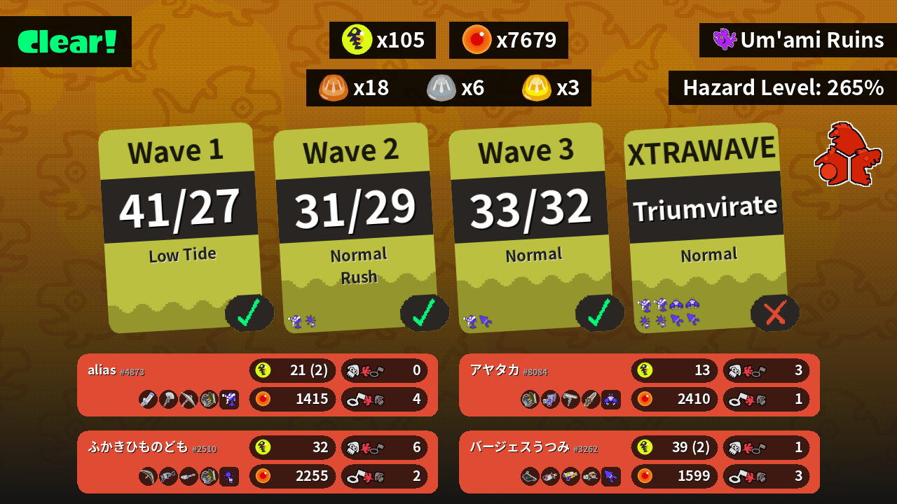 | Weapons | Mint Decavitator Painbrush Recycled Brella 24 Mk I Grizzco Slosher | Bloblobber .96 Gal Splattershot Grizzco Blaster | Tenta Brella H-3 Nozzlenose E-liter 4K Grizzco Slosher | Grizzco Slosher Glooga Dualies Dynamo Roller Grizzco Splatana |