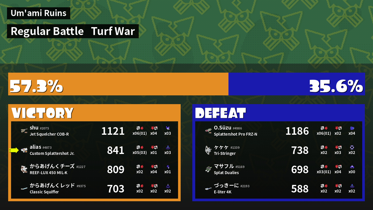 | Medals | #1 Splat Assister #1 Damage Taker #1 Ink Consumer | ||