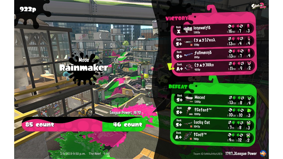 | Mode | Rainmaker - League Battle (Twin) | ||||||||||||||||||||||||||||||||||