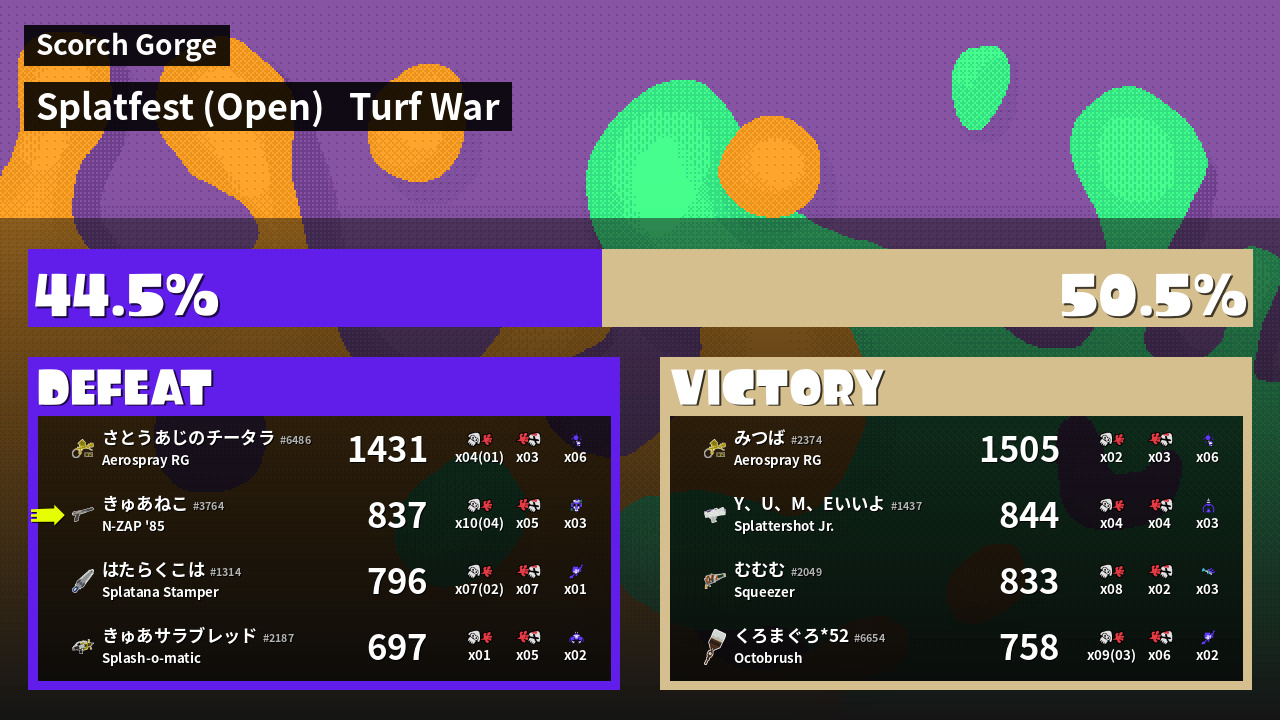 | Medals | #1 Overall Splatter #1 Enemy Splatter #1 Splat Assister | ||