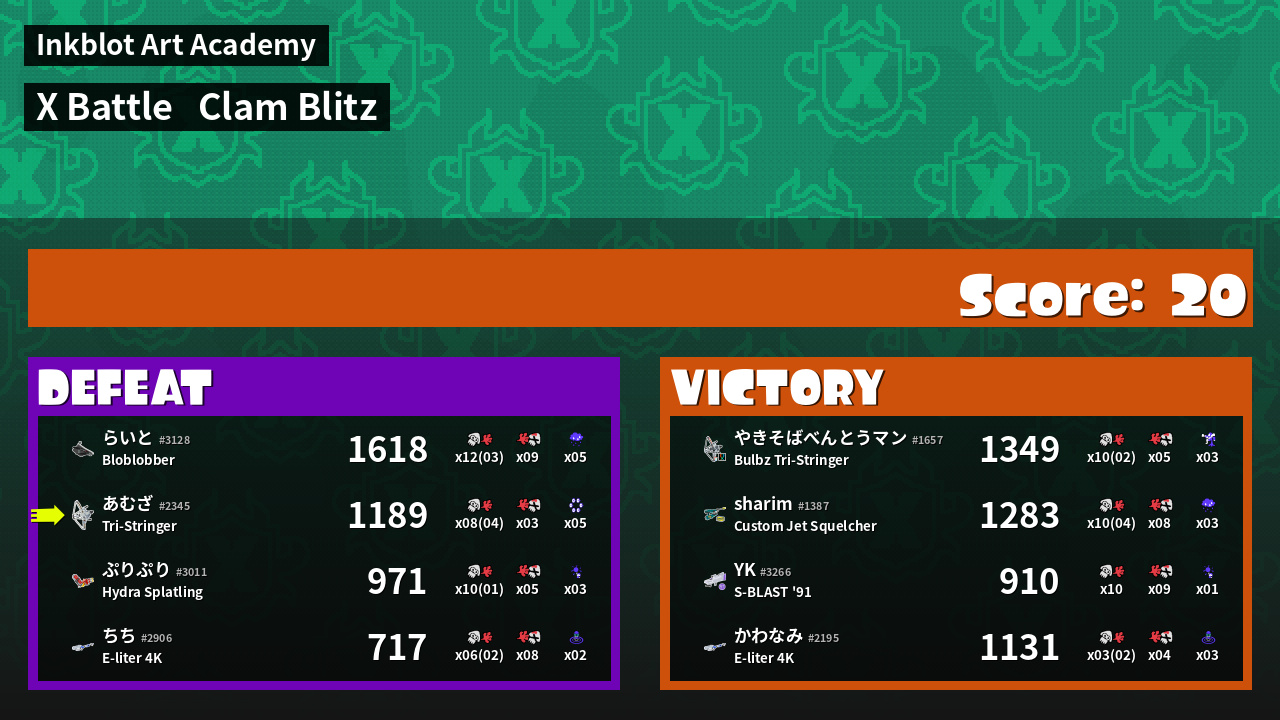 | Medals | #1 Clam Carrier #1 Popular Target #1 Splat Assister | ||