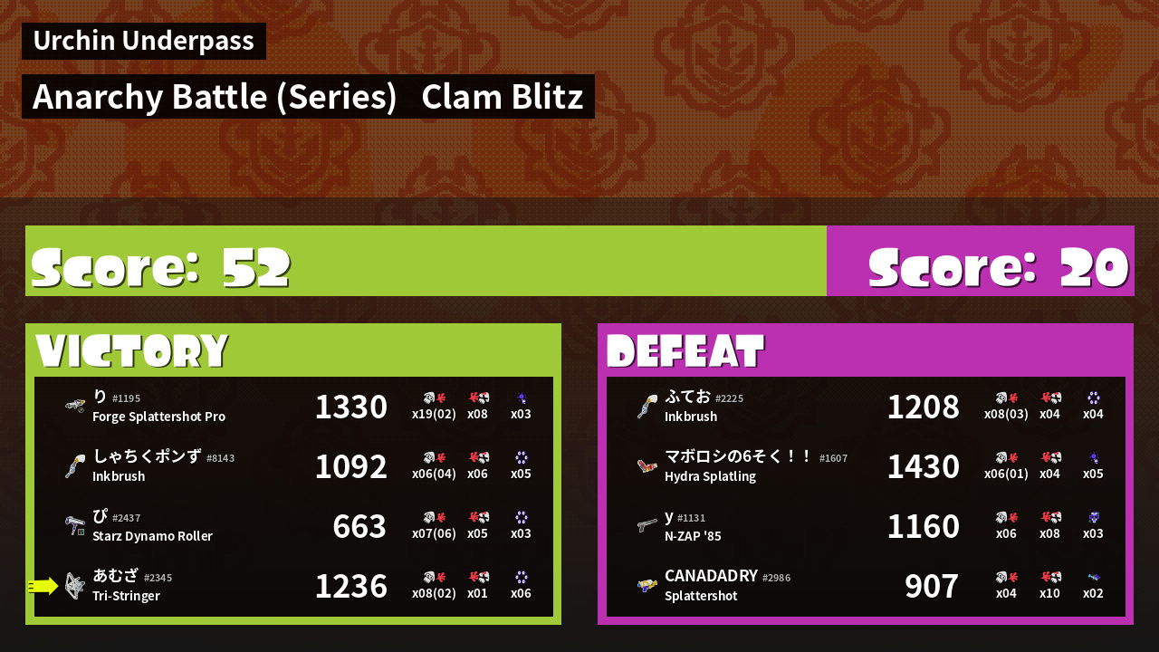 | Medals | #1 Score Booster #2 Overall Splatter #2 Clam Carrier | ||