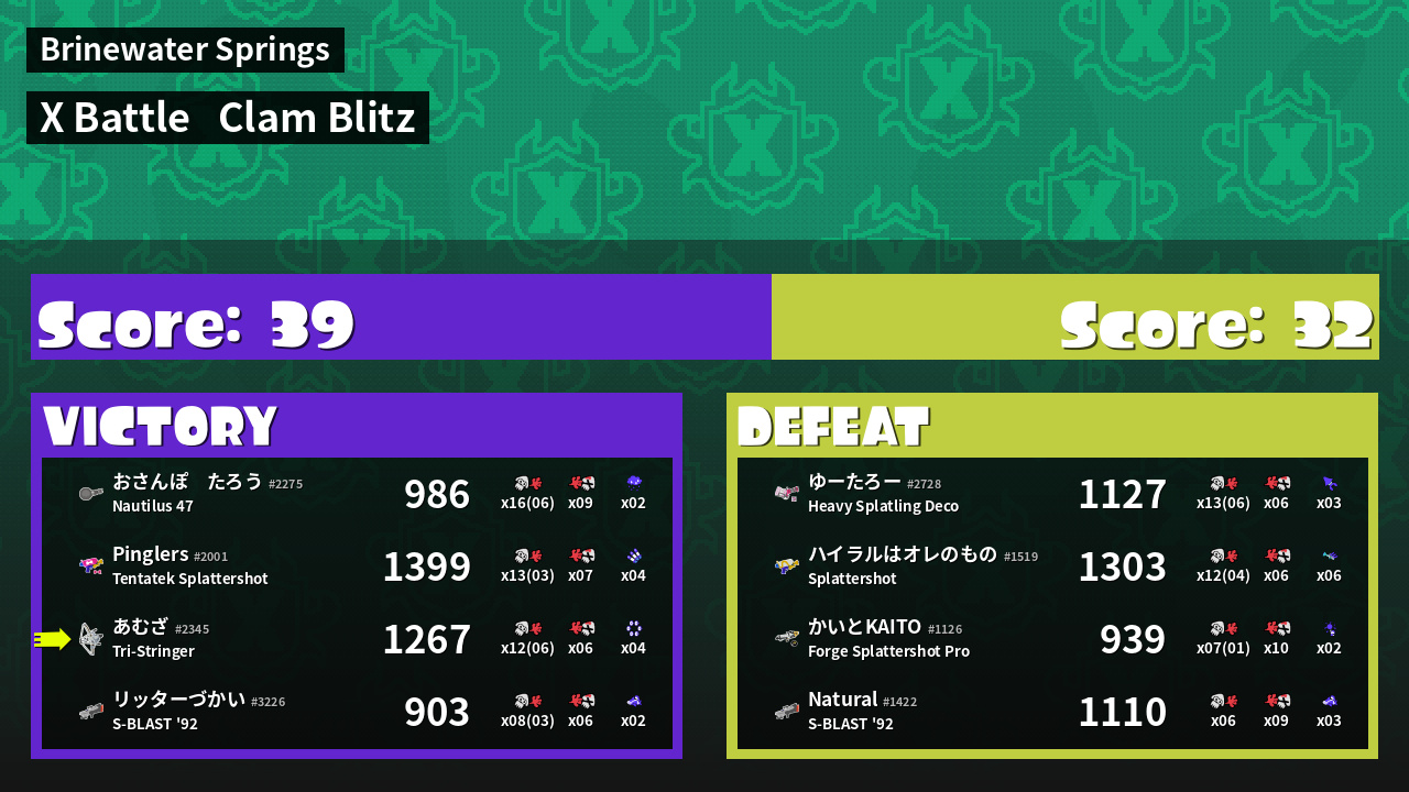 | Medals | #1 Super Jump Spot #1 Splat Assister #1 Clam Stopper | ||