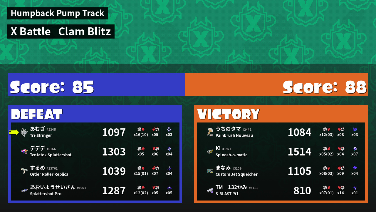 | Medals | #1 Overall Splatter #1 Score Booster #1 Clam Carrier | ||