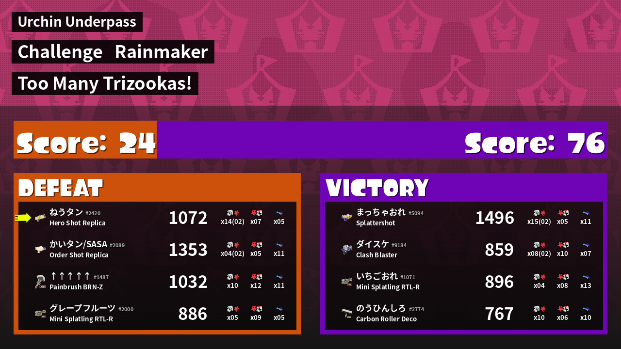 | Medals | #1 Overall Splatter #1 Enemy Splatter #1 Splat Assister |