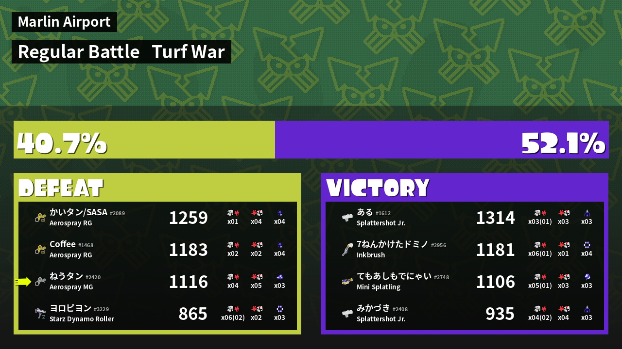 | ツイてる勝負師  ある #1612 |  Splattershot Jr.                    | 1,314 | 2 + 1 | 3 | 0.67 |  3 | |