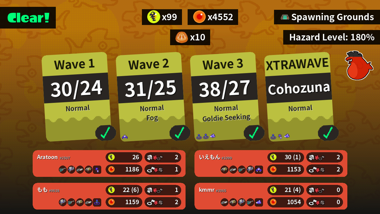 | Weapons | Jet Squelcher Clash Blaster Ballpoint Splatling Splash-o-matic | Splash-o-matic Ballpoint Splatling Jet Squelcher Clash Blaster | Clash Blaster Jet Squelcher Splash-o-matic Ballpoint Splatling | Ballpoint Splatling Splash-o-matic Clash Blaster Jet Squelcher |