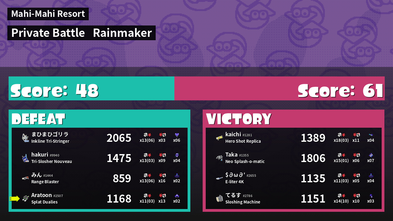 | Medals | #1 Rainmaker Stopper #1 Crab Tank User #2 Enemy Splatter | ||