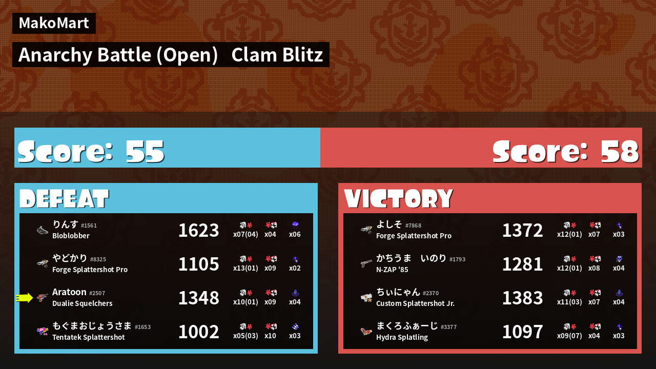 | Mode | Clam Blitz - Anarchy Battle (Open) | ||