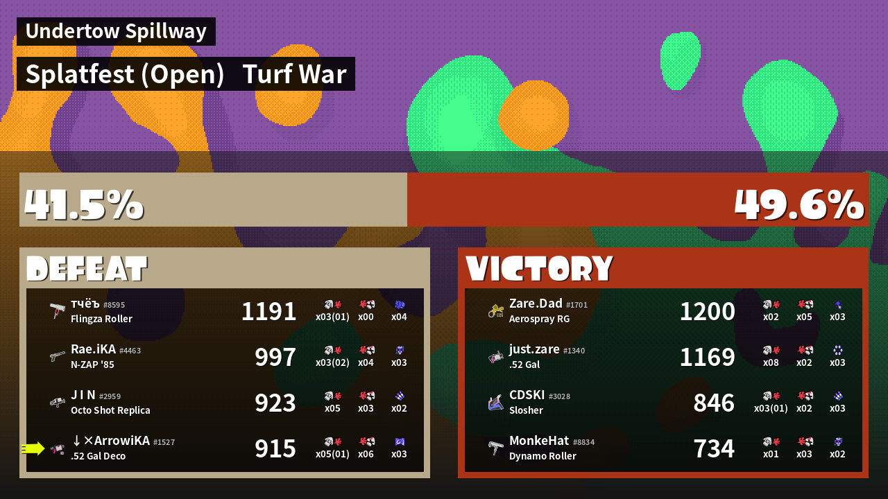 | Medals | #1 Overall Splatter #1 Enemy-Base Inker First Splat! | ||