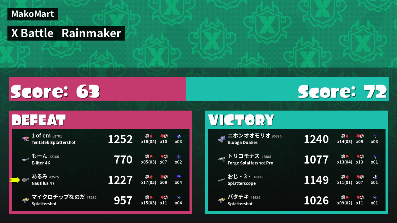 | Medals | #1 Splat Assister #1 Rainmaker Stopper #1 Ground Traveler | ||