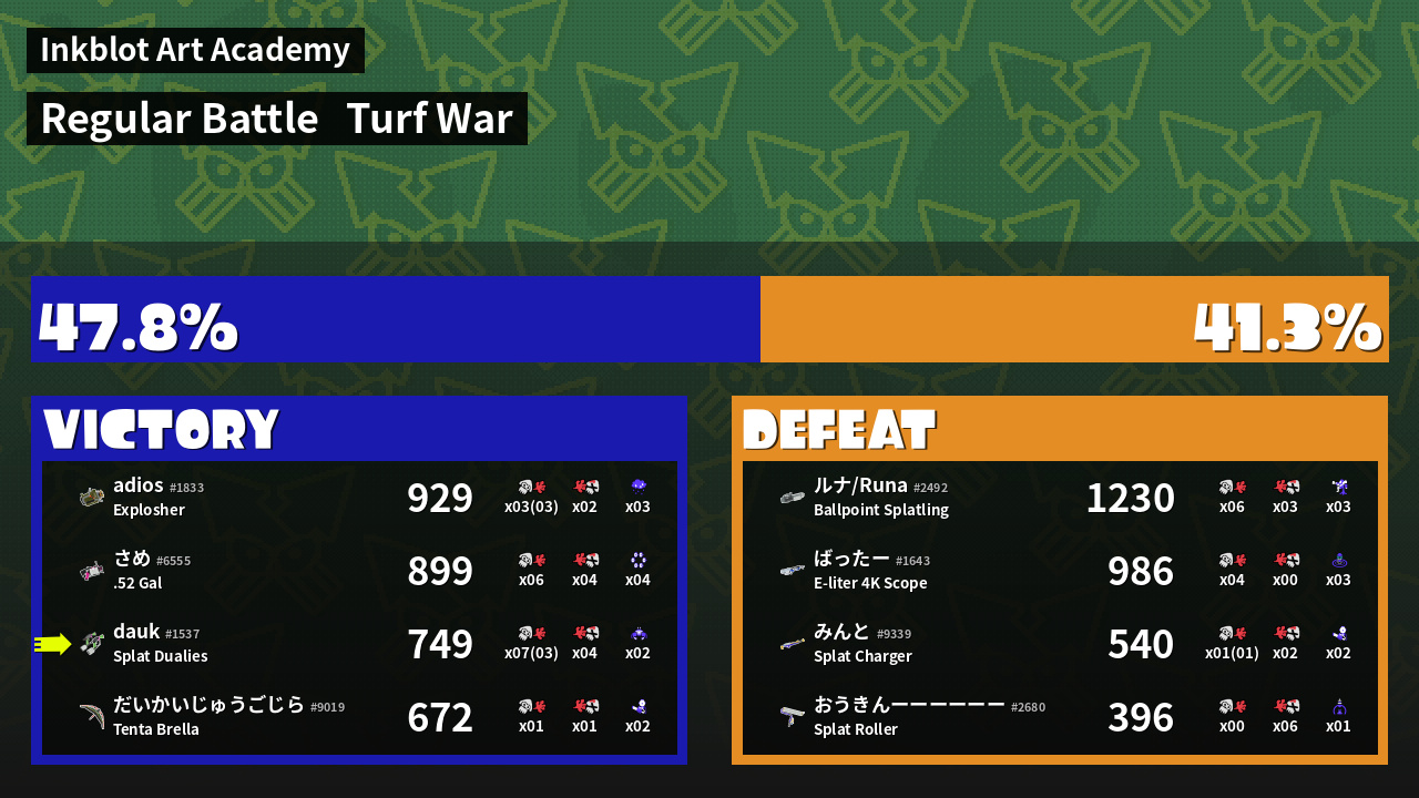 | Medals | #1 Overall Splatter #1 Popular Target #1 Enemy-Base Inker | ||