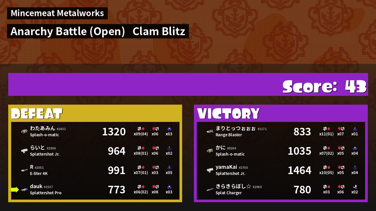 | Mode | Clam Blitz - Anarchy Battle (Open) | ||